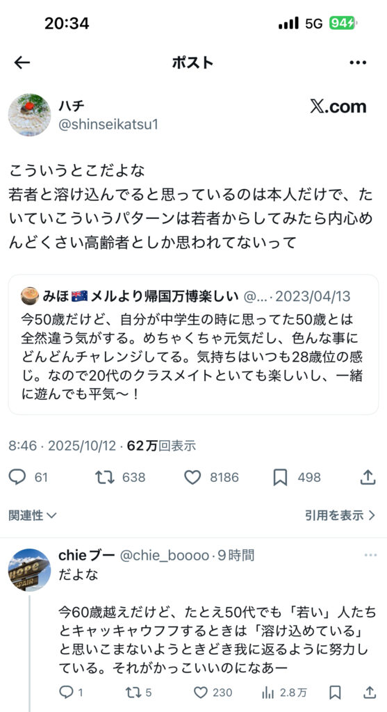 年齢関係ない論者は、若者に対する距離感と自認がバグっており、溶け込めてると錯覚しながら周りにだいぶ気を遣わせていたり、厄介な人と思われている。