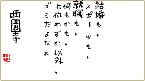説明しよう!西園寺貴文とは、常識と大衆に反逆する「社会不適合者」である!平日の昼間っからスタバでゴロゴロするかと思えば、そのまま軽いノリでソー◯をお風呂代わりに利用。挙句の果てには気分で空港に向かい、当日券でそのままどこかへ飛んでしまうという自由を履き違えたピーターパンである!「働かざること山の如し」。彼がただのニートと違う点はたった1つだけ!そう。それは「圧倒的な書く力」である。ペンは剣よりも強し。ペンを握った男の「逆転」ヒップホッパー的反逆人生。そして「ここ」は、そんな西園寺貴文の生き方を後続の者たちへと伝承する、極めてアンダーグラウンドな世界である。 U-18、厳禁。低脳、厳禁。情弱、厳禁。