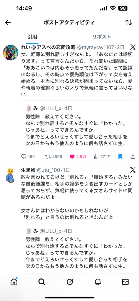 どうせ些細なことで揉めたにすぎないのに、それごときですぐ他の男を持ち出す女と、誰が一生を共にしようと思うの?