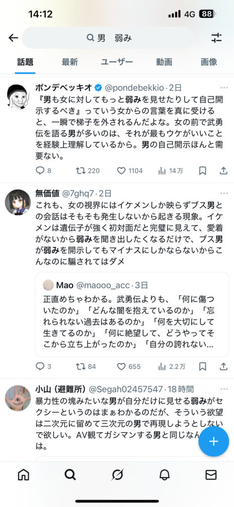 - 女にガチの相談をしない、頭脳や社会経済的なタフ力に期待しない(期待できる女はそもそも社会的地位や稼ぎにもう現れてる)