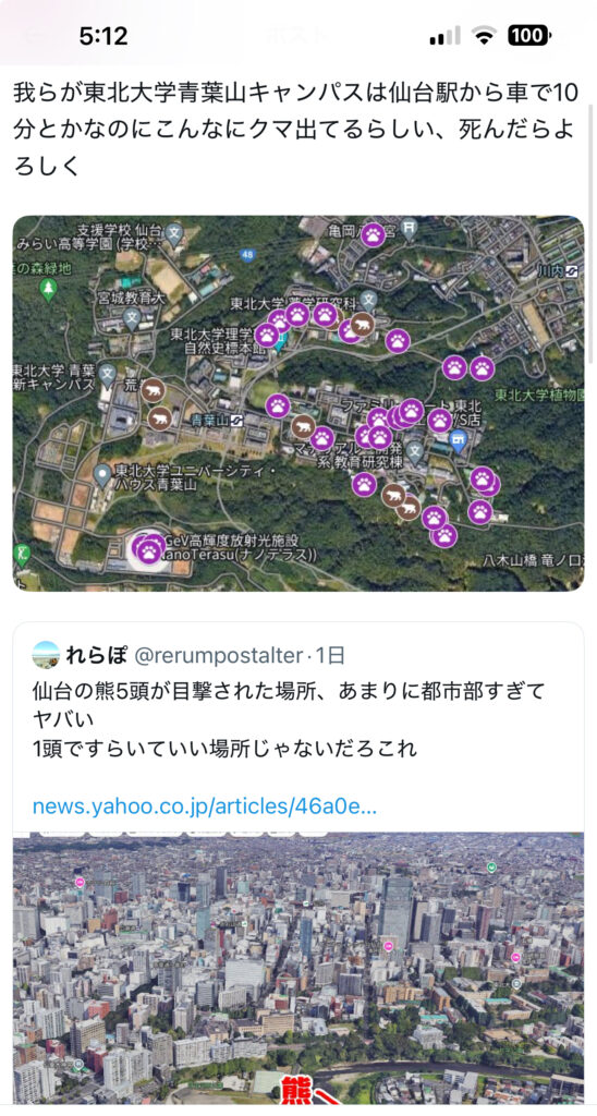 東北大のキャンパスがめっちゃクマ出てるところのめっちゃ近く