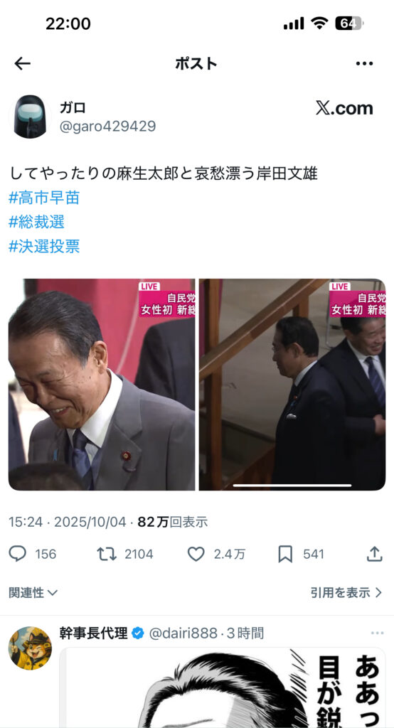 AB型、O型のキングメーカー、散る。A型麻生の采配が効き、麻生の影響力復活。